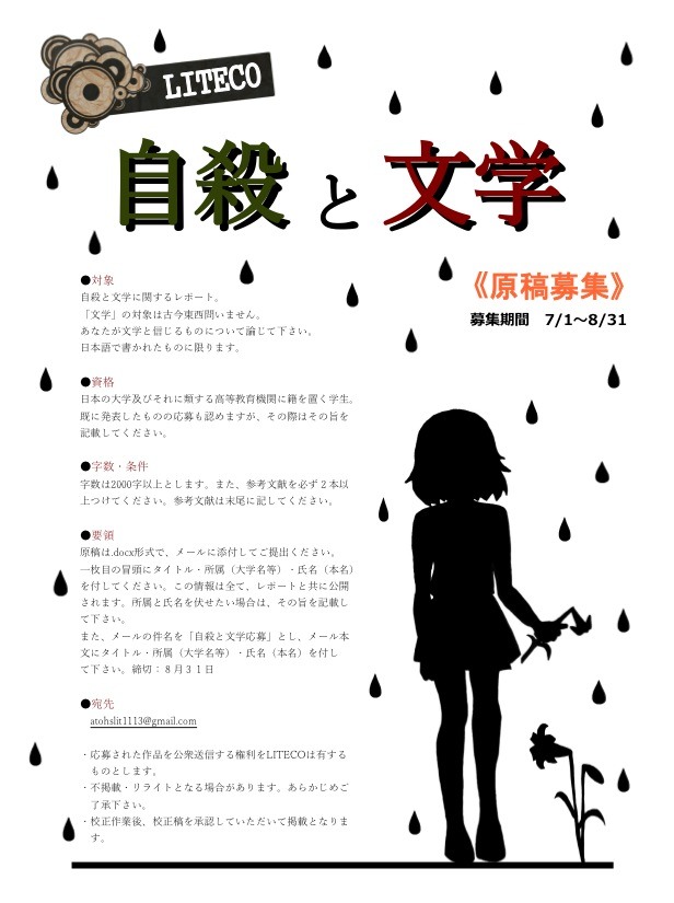 また、メールタイトルを「自殺と文学応募」とし、メール本文にタイトル・所属(大学名等)・氏名(本名)を付してください。